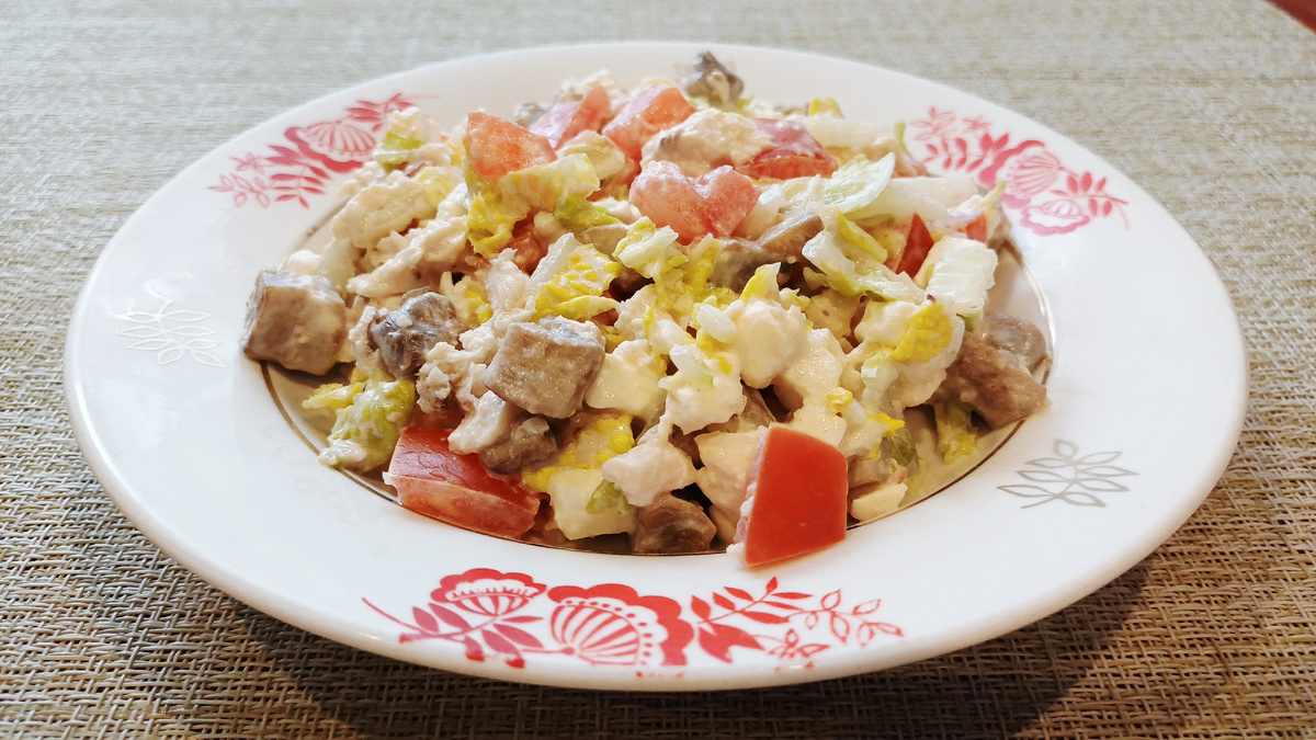 Всем привет! Я к вам с рецептом очень вкусного, яркого, сочного салата. У салата необычный насыщенный вкус с тонкой ноткой чесночно-горчичного соуса. Готовим😊 300 гр отварной куриной грудки (в подсоленной воде) режем кубиком. 300-400 гр шампиньонов режем кубиком и обжариваем на растительном масле с добавлением соли. Остывшие шампиньоны отправляем в салат. 150 гр сыра фетакса нарезаем кубиком. 4 свежих томата режем кубиком, предварительно удалив сердцевину. 100-150 гр пекинской капусты нарезаем соломкой. Готовим соус : 1 ст.л. майонеза 1 ст.л. сметаны 1 ч.л. горчицы 1 ч.л. сухого чеснока Всё смешиваем и соус готов. Отправляем соус в салат и всё перемешиваем. Салат готов. Вкуснота и красота👍😋 Приятного аппетита! Хорошего дня и отличного настроения! 🤗