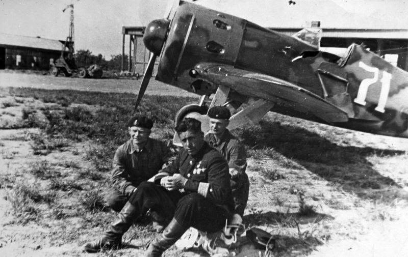Герой Советского Союза командир 13-го истребительного авиаполка ВВС Балтийского флота подполковник Иван Георгиевич Романенко с техниками у