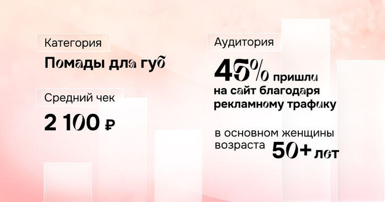 Мы продолжаем серию текстов о читательском поведении на портале. Интересно, на что чаще всего кликают наши посетители? Больше это не секрет! В прошлый раз говорили о ювелирных украшениях, уходе за лицом и мебели. Сегодня проанализируем категорию «Макияж»! 45 % покупательниц рубрики «Макияж» пришли на сайт благодаря рекламному трафику, который велся на рубрику «Макияж для губ» (в основном женщины возраста 50+), 43 % пришли из поисковых систем. Рубрика «Помады для губ» — одна из популярных благодаря рекламному трафику. Средний чек — 2 100 рублей. Зачастую читательницы выбирают неяркие, близкие к естественным тонам губ оттенки помад — розовые, бежевые. Финиш — матовый или глянцевый. Покупают товары как из массмаркета, так и более дорогие бренды (Tom Ford, Charlotte Tilbury, Christian Louboutin). С поисковых систем приходит молодая аудитория — 30 % от 25 до 54 лет — и преимущественно по брендовым запросам: «косметика для губ catrice купить», «тушь artdeco», «консилеры для лица купить в маг