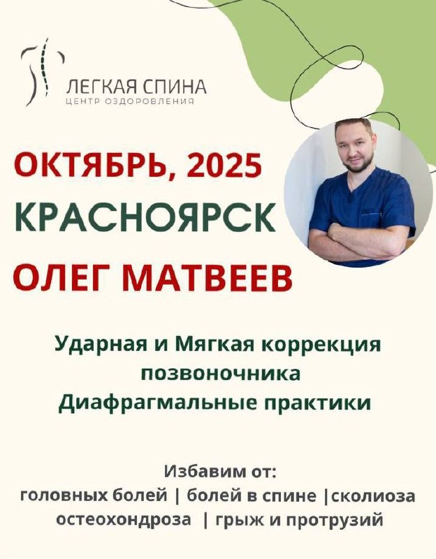 💥КРАСНОЯРСК В октябре планируется прием у специалиста центра Легкая Спина Олега Матвеева в нескольких направлениях: 🔸 мягкая коррекция позвоночника 🔸 ударная коррекция позвоночника 🔸 диафрагмальные практики За один прием: 🌿 ваши позвонки выровнят в анатомически правильное состояние 🌿 снимут зажимы и боль в спине 🌿 избавят от напряжения в диафрагме 🌿 определят нарушения работы внутренних органов и проконсультируют по дальнейшим действиям ✍️ Запись по телефону + 7 (926) 495-29-42 Центр Легкая Спина - мы избавляем от причины боли, а не от симптомов 🌿