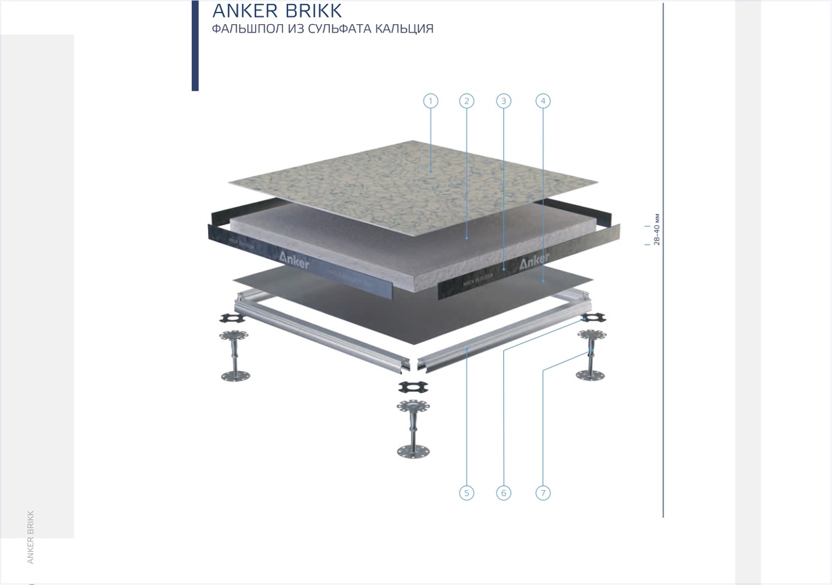 ANKER BRIKK - классический разборный фальшпол на минеральной основе (сульфат кальция). Кромка ABS, снизу - стальной лист либо алюминиевая фольга; в составе предусмотрены стрингеры и уплотнители. Это рабочая лошадка для зон с высокой плотностью инженерки и требованием быстрых вмешательств.