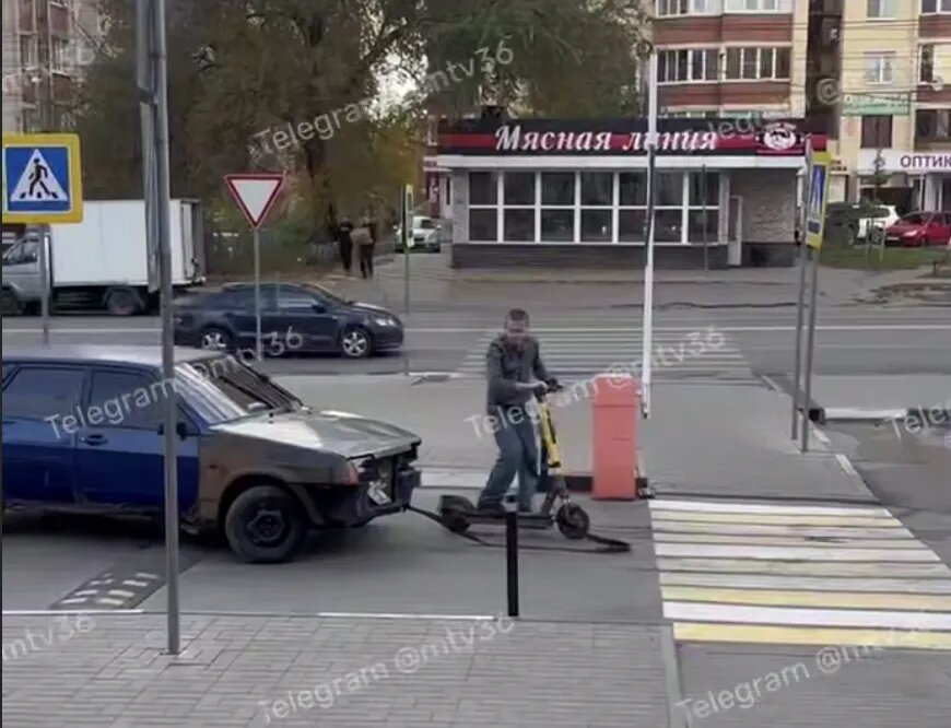 Взять на буксир заглохшую «девятку» попытался водитель электросамоката. Правда, у отчаянного парня ничего не получилось. Мощностей не хватило.