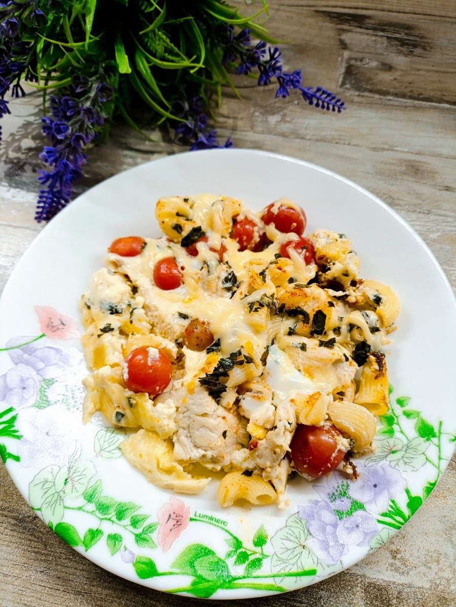 На горячую сковороду с маслом: помидорки, курочку или бекончик/колбаску (кому что нравится) 🥓 Прижариваем, добавляем щепотку любимых специй (у меня сегодня базилик 🌿). Туда же готовые макарошки, заливаем омлетной болтушкой и щедро посыпаем сыром! 🧀
