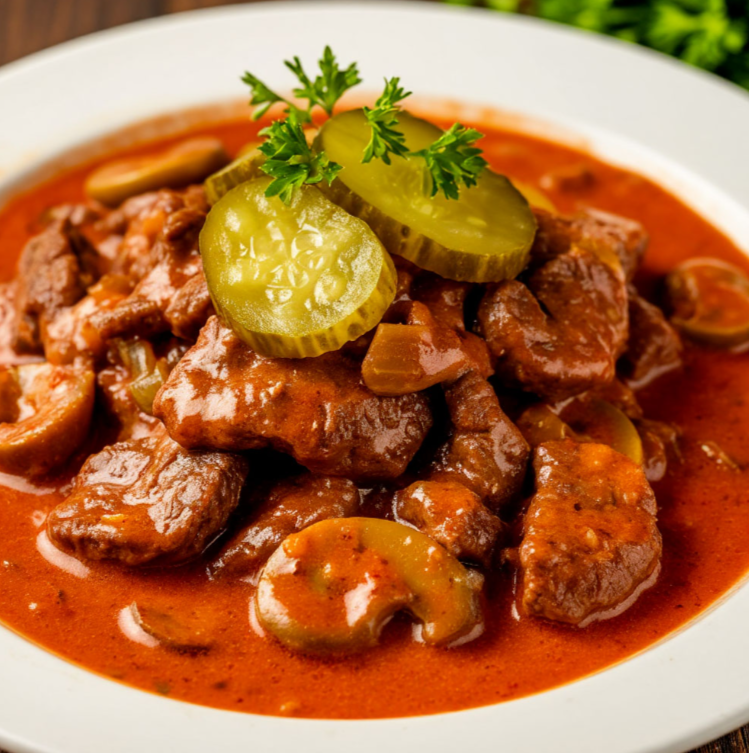 Бефстроганов с солеными огурцами – это классическое блюдо русской кухни, которое отличается своим насыщенным вкусом и ароматом. Кисло-соленые огурчики придают блюду особую пикантность, делая его неповторимым. Давайте приготовим этот шедевр кулинарии вместе! Для начала нам понадобится 500 грамм говядины. Лучше всего использовать вырезку или тонкий край. Мясо нужно нарезать тонкими полосками, поперек волокон. Затем берем 100 грамм соленых огурцов и нарезаем их небольшими кубиками или соломкой. Также нам потребуется 70 грамм репчатого лука. Лук нарезаем полукольцами или четвертькольцами. Добавляем к ингредиентам 1 столовую ложку горчицы. Горчица придаст блюду пикантность и аромат. Кладем 1 чайную ложку томатной пасты. Теперь подготовим заправку. Нам понадобится 300 миллилитров сливок или сметаны. Жирность выбирайте на свой вкус. Соль