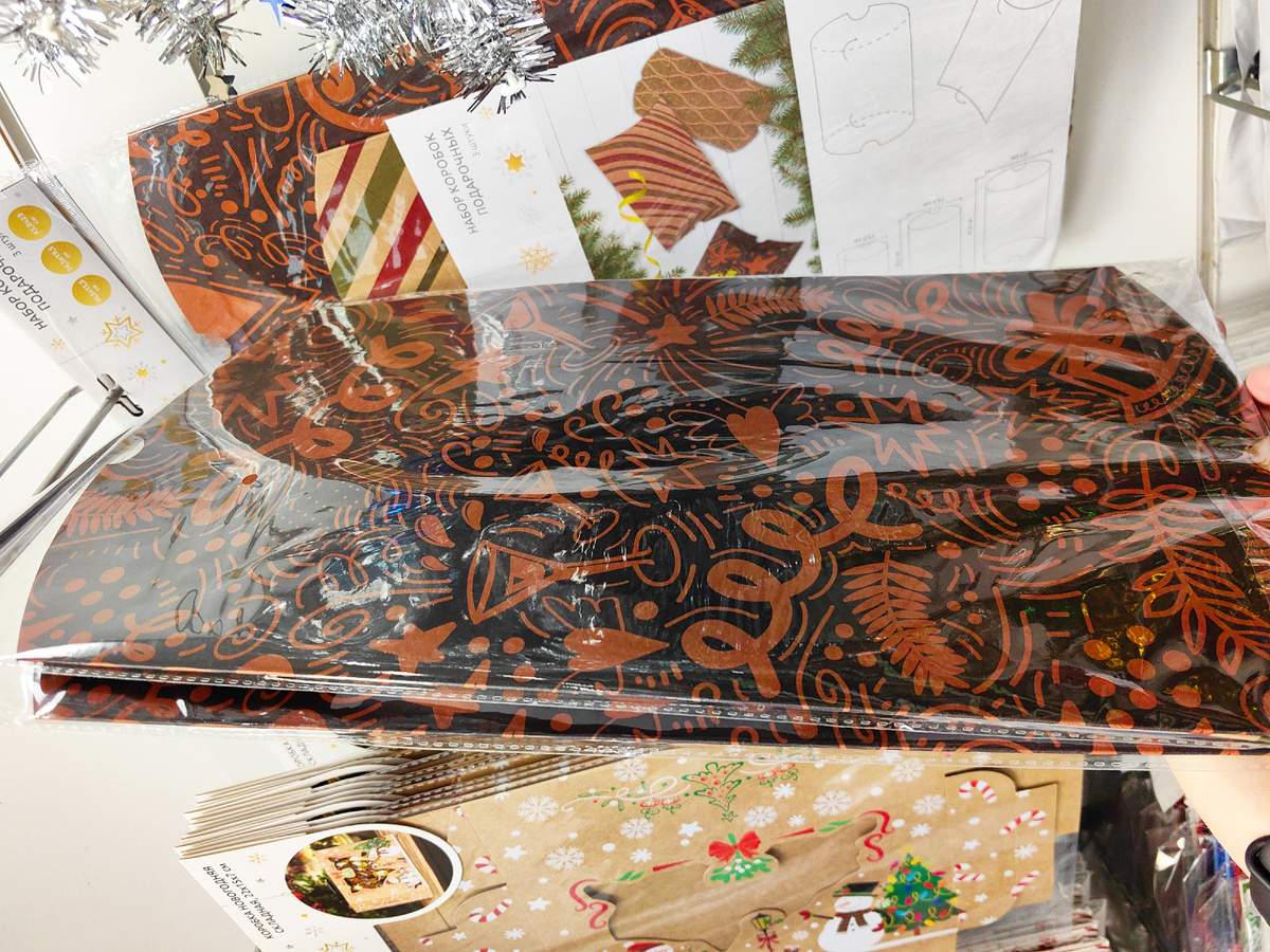 Удалось сегодня найти немало новинок в Фикс Прайс. Посмотрите, таких наборов раньше не было. В упаковке картонные коробки. На вид плоские, как конверт. А на деле становятся объёмными цилиндрами. Необычная упаковка новогоднего подарка. В пакет всегда можно заглянуть, сразу узнать, что подарили. А с новинкой интрига сохранится дольше.