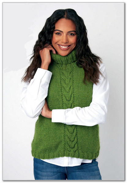 Если вы хотите быстро связать изделие или сделать свою первую вещь с косами, эта простая модель — настоящий хит. Безрукавка с воротником гольф и косой - отличный выбор!