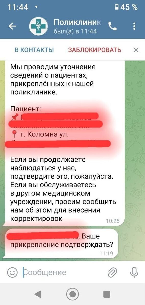Мошенники от лица сотрудников поликлиник Коломенской больницы рассылают сообщения в Telegram с просьбой подтвердить прикрепление к поликлинике.
