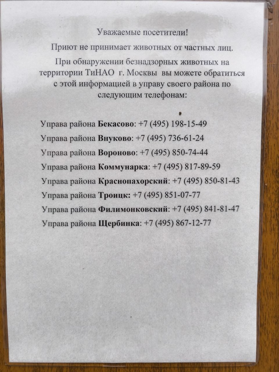 👆 На двери висит объявление, куда нужно обратиться, чтобы ваше животное забрало государство и предоставило ему в лучшем случае выживальческие условия содержания.