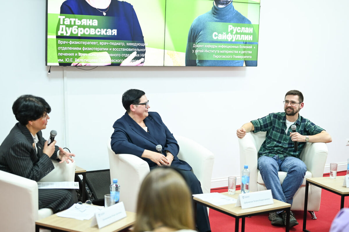 Спикерами выступили доцент кафедры инфекционных болезней у детей ИМД Руслан Фаридович Сайфуллин и заведующий отделением физиотерапии и восстановительного лечения Института Вельтищева Пироговского Университета Татьяна Владиславовна Дубровская.
