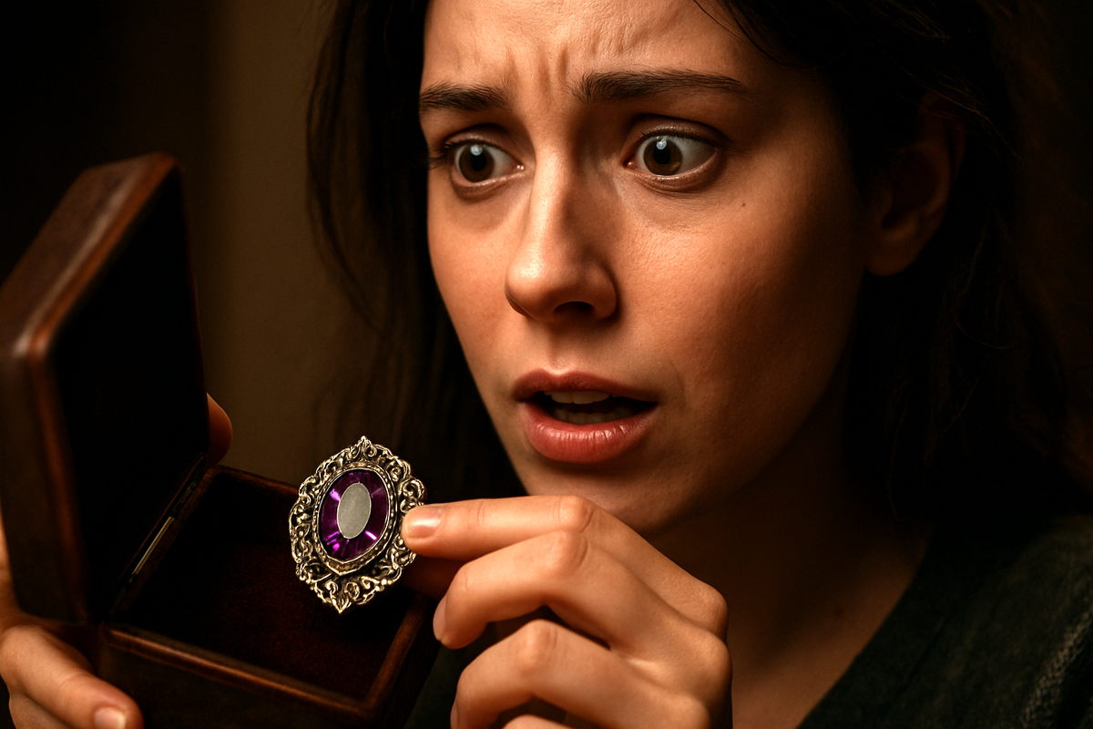 Она скрылась в своей комнате, а через минуту вернулась с бархатным футляром. Внутри лежала брошь — родная, блестящая, будто никогда не покидала шкатулку.