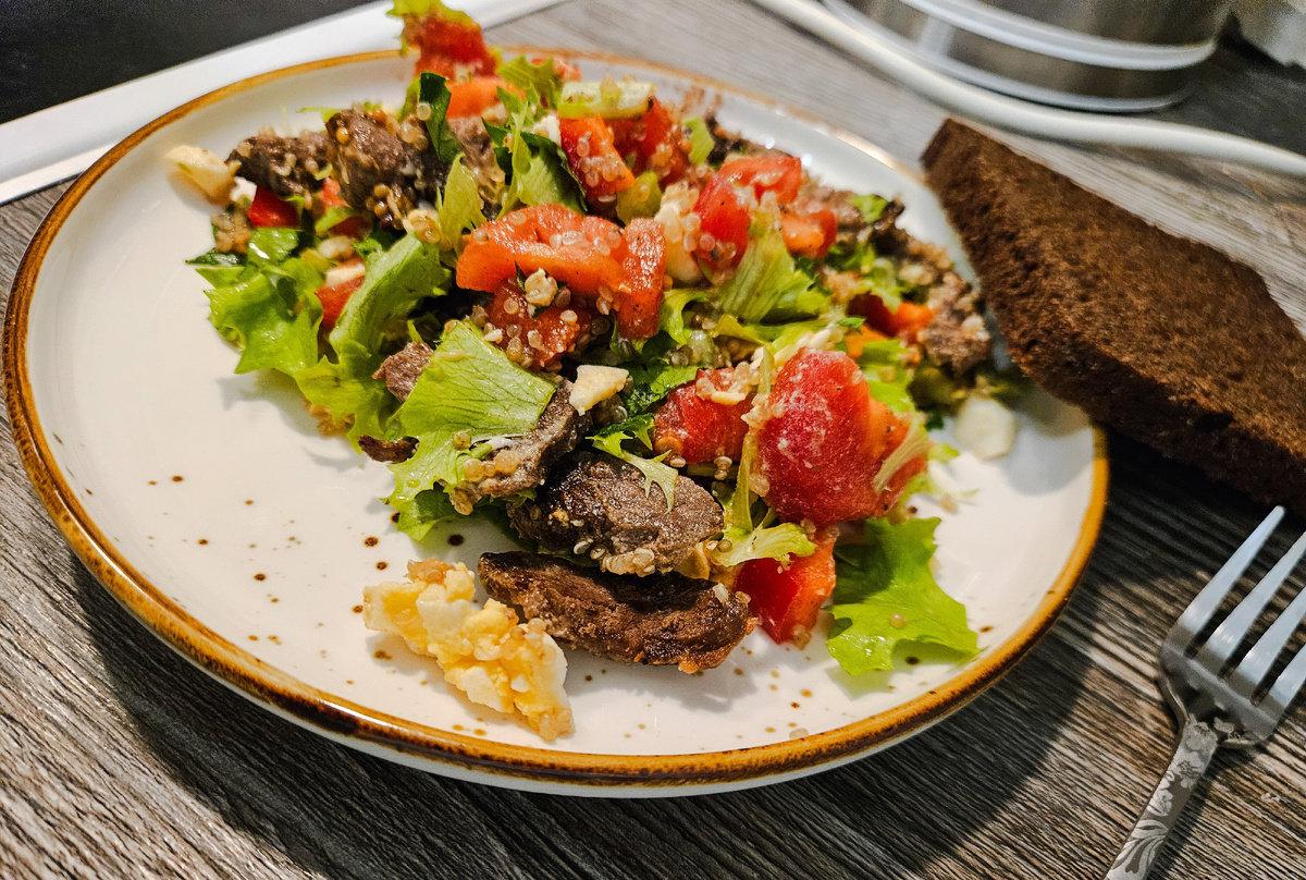Очень необычный пряный салат . Готовится не сложно, из того, что есть дома. Давайте приготовим . Ингредиенты: - 200 грамм говядины мякоти без жира ; - 1/2 пучка салата зеленого; - 2 шт. яйца куриного; - 40 грамм киноа или пшена ; - 1 шт. сладкого перца; - 100 грамм помидор. - пучок петрушки; - щепотка черного молотого перца. Ингредиенты на соус: - 1ч.ложка горчицы зернами на меду; - 1 ч. ложка меда; - 1 зубчик чеснока; - 1 ч. ложка растительного или оливкового масла; - 15-20 грамм соевого соуса. Пошаговая инструкция : 1) Займемся мясом говядины. Нарежем тонкими слайсами мясо и порежем на 4 части каждый слайс. 2) Нагреем сковороду с каплей масла растительного и отправим туда слайсы говяжьего мяса . Зажариваем с корочкой 15 мин. 3) Поставим отвариваться в крутую яйца куриные. 4) Поставим варить киноа или пшено до готовности , мягкости . 5) Подготовим большую миску для салата. Возьмем помидоры и счистим кожуру. Почистим перец. Мелко порежем кубиками и помидоры, и перец. 6) Положим