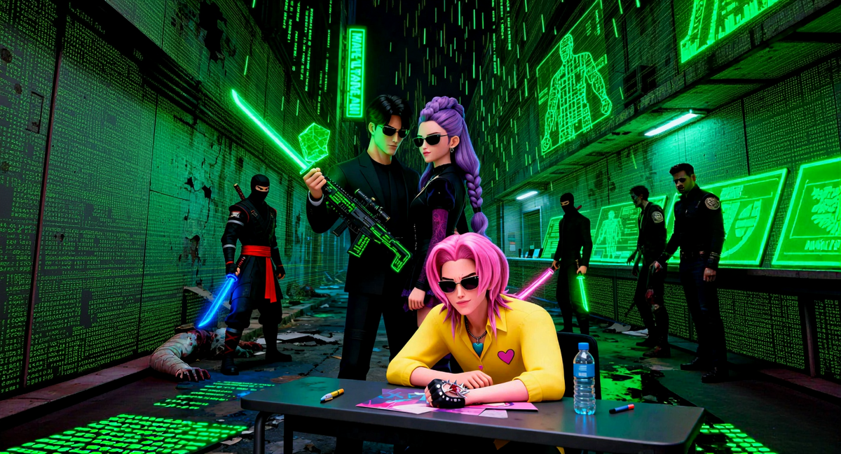 Мир Huntrix всегда был жестоким. Демоны правили из тени, люди жили в иллюзиях, а охотники сражались в одиночку. Но всё изменилось, когда они обнаружили Истину: мир, в котором они жили, был не настоящим. Это началось с странных глюков. Руми увидела, как демон растворился в цифровом шум, а Зои услышала голоса, которые говорили: "Ты всё ещё спишь". Они поняли: их реальность — ловушка. Матрица демонов была совершенной системой. Люди видели то, что хотели видеть, а демоны питались их энергией. Но Huntrix не могли смириться. Они нашли Оракула — старую ведьму, которая знала правду. — "Вы не первые, кто пытается вырваться," — сказала она. — "Но вы первые, кто сможет это сделать." Они тренировались в заброшенных серверах, учились видеть код демонов и сражаться в цифровом мире. Джину первым научился останавливать демонические программы, а Руми взломала главный сервер, где сидел Архитектор — древний демон, который управлял иллюзией. Финальная битва произошла в белом цифровом пространстве, где