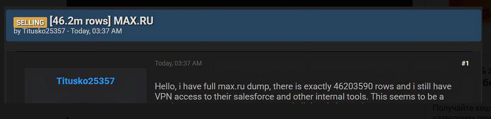 19 октября появилась информация о взломе мессенджера МАХ. "Привет, у меня есть полный дамп max.ru, в нём ровно 46 203 590 строк, и у меня всё ещё есть доступ через *** (средство обхода) к их Salesforce и другим внутренним инструментам". сообщил о взломе мессенджера МАХ на форуме DarkForums некий Titusko25357 В доказательство взлома МАХ Titusko25357 выложил в открытый доступ имена/фамилии, номера телефонов, а также ID и аватарки профилей с «Госуслуг» Однако, взлом мессенджера в Минцифре отрицают. "Автором информации об утечке был выложен сэмпл, содержащий 15 записей, в которых были указаны якобы ID пользователей Госуслуг. Проверка показала, что ни по одной из опубликованных записей ID Госуслуг не совпадает с ФИО реальных пользователей",- заявили в пресс-службе ведомства. Желающие обсудить взлом мессенджера МАХ, могут сделать это в комментариях.