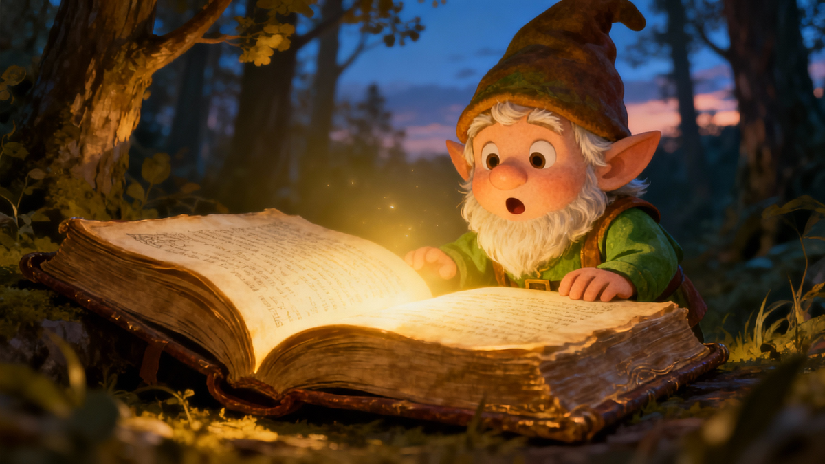 В одном волшебном лесу жил маленький гномик по имени Фло. Он был любопытным и очень умным, а его жизнь была полна разных приключений и чудес. Однажды, гуляя по лесу, он наткнулся на старую, покрытую пылью книгу, которая лежала прямо у подножия большого дерева. Книга была необычной — на обложке сияли таинственные золотые руны, а её страницы излучали слабый свет. Фло осторожно открыл книгу и понял, что это не простая книга. На её страницах было написано будущее, точь-в-точь, что случится с ним, его друзьями, и даже в самом лесу. Гномик был поражён: эта книга могла предсказывать всё! Сначала Фло просто почитал её для развлечения. Он заглядывал в неё, чтобы узнать, что его ждёт в будущем, и на удивление всё, о чём он читал, сбывалось. Например, он узнал, что завтра встретит старого друга, а когда он пошёл к лесному озеру, действительно встретил того самого друга, с которым не виделся много лет. С каждым днём Фло стал всё больше полагаться на книгу. Он проверял её, чтобы узнать, что его жд