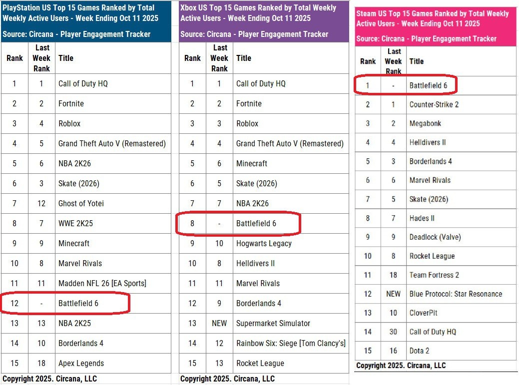 Battlefield 6 дебютировала в американских чартах по числу еженедельных игроков на 12 и 8 местах для PlayStation и Xbox соответственно — Call of Duty (Black Ops 6, бета Black Ops 7, Warzone) при этом на первом месте. Для Battlefield 6 учитывалось только два дня из семи. В Steam ситуация совсем другая: там Battlefield 6 заняла первую строчку, тогда как Call of Duty HQ — 14, и это был рост аж с 30 месте.