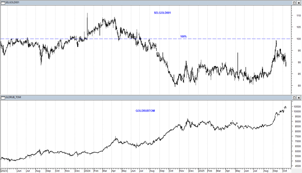 На рис.1 вверху ежедневный график облигаций SELGOLD001, внизу – золото GOLDRUBTOM. И тут мы сразу понимаем, что что-то ту не то. Биржевой график «золотых» облигаций никоим образом не коррелирует с графиком биржевого золота. Например, весь 2024 год, когда золото сильно росло, котировки SELGOLD001 напротив, сильно падали. Да и в целом, рыночная цена этих «золотых» облигаций в целом не растет, и сейчас они даже ниже котировки размещения. Кстати, большую часть периода обращения эти облигации торгуются ниже номинальной стоимости, с приличным дисконтом. О том, почему присутствует дисконт – поговорим далее. А вот почему э график «золотой» облигации совсем не соответствует графику самого золота – тут все просто. Для того, чтобы оценить рыночную динамику такой «золотой» облигации, нужно построить график рыночной цены не в % от номинала, а именно в рублях. А для этого, нужно просто перемножить биржевую котировку в % от номинала на номинал, который представляет собой, согласно условиям выпуска, официальную цену 1 грамма золота в России. Причем и тут есть тоже некая сложность. По условиям выпуска облигаций SELGOLD001, номинал облигации равен официальной цене одного грамма золота от ЦБ РФ, но не в день биржевой сделки, а (внимание!) : за три дня до даты расчетов по ссделке. Если учесть, что облигации торгуются на Мосбирже с расчетами Т+1, то есть на следующий день после сделки, то рассчитать реальную биржевую цену SELGOLD001 не так уж просто. К этому немного странному алгоритму расчета номинальной цены мы еще вернемся позднее, тут тоже есть, о чем поговорить. А пока, согласно этому сложному алгоритму, я рассчитал все же реальную биржевую цену этой «золотой» облигации на каждый торговый день с момента ее выпуска до 10.10.2025. Результат представлен на рис.2, опять-таки в сравнении с биржевым золотом GOLDRUBTOM.