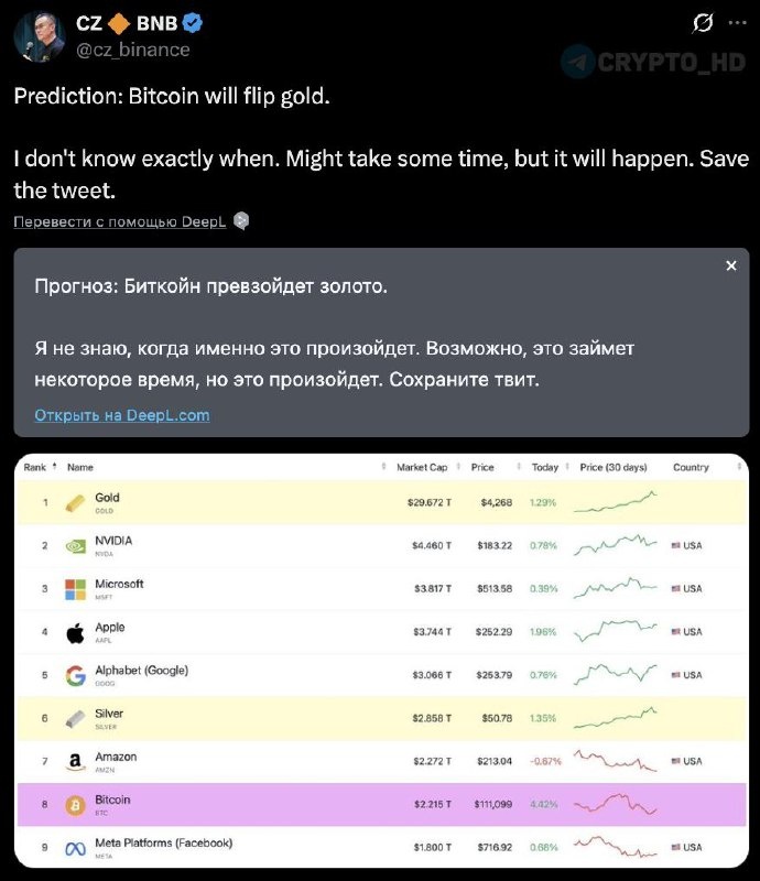 🐂 Прогноз от CZ: Биткоин превзойдет Золото (original) «Я не знаю, когда именно это произойдет. Возможно, это займет некоторое время, но однажды это случится». Сryptо Headlines