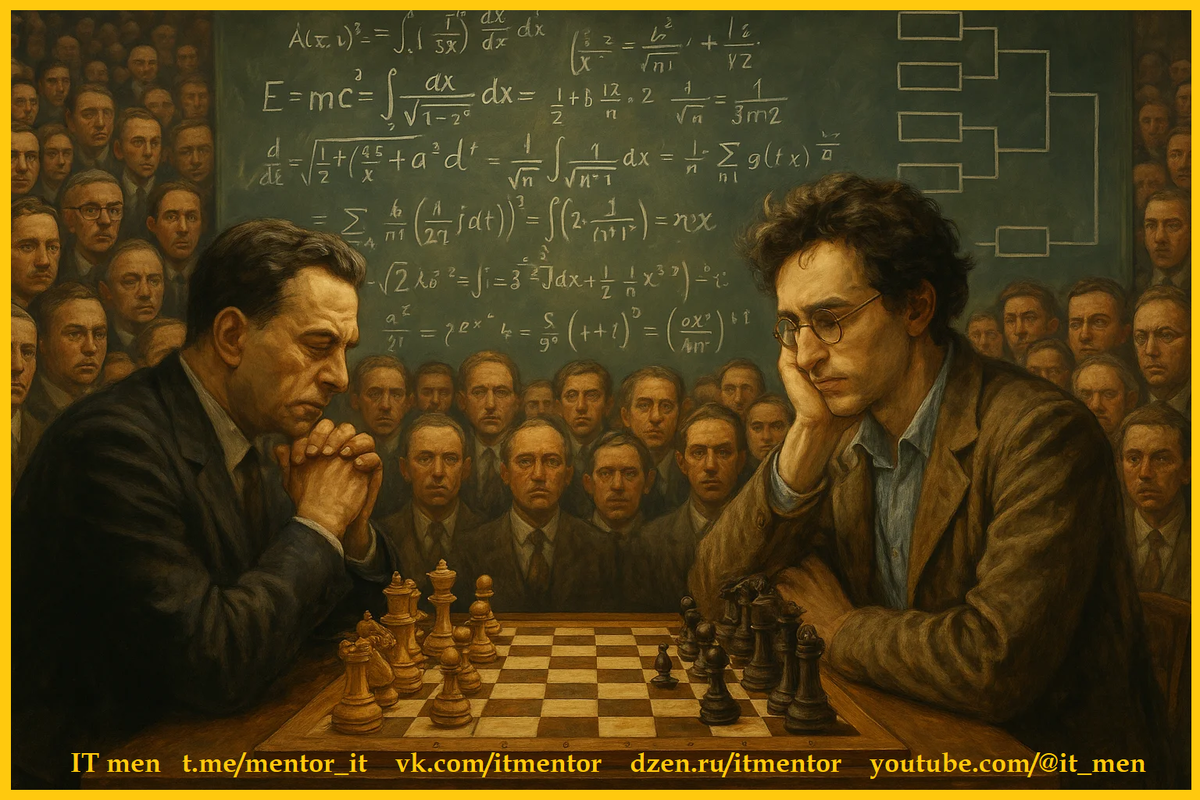 Если бы в шахматы играл весь мир, то абсолютному победителю нужно было бы провести 33 игры и выиграть в каждой. Удивительно... но почему так мало игр? Ведь во всём мире так много людей. Давайте разбираться с точки зрения математики 🤔🧐 Возьмем приблизительное количество людей на планете: ~8 миллиардов (8 000 000 000). В турнире 1 на 1 (на выбывание) проигравший сразу покидает турнир. Тогда чтобы в турнире на выбывание определить одного победителя, должен выбыть каждый участник, кроме одного. ▪️ Если участников N, то должно выбить (N - 1) человек. ▪️ В каждой игре выбывает ровно 1 человек (проигравший текущую игру). ▪️ Значит, чтобы выбыло N - 1 человек, необходимо ровно N - 1 игр. Пример для 4 человек: А, Б, В, Г :