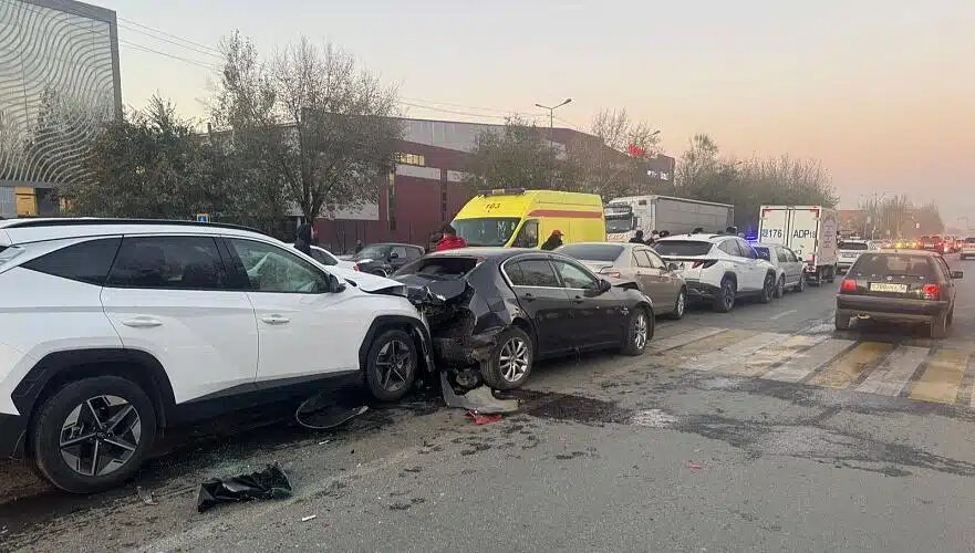 В Усть-Каменогорске на улице Каржаубайулы произошло крупное ДТП с участием пяти автомобилей, сообщили в пресс-службе департамента полиции области Абай. По данным ведомства, авария случилась 20 октября около 16:29. За рулем автомобиля Hyundai Tucson находился 60-летний водитель, который, по предварительным данным, не убедился в безопасности дорожного движения и не выбрал безопасную скорость. В результате его машина врезалась в стоявший впереди Nissan Skyline под управлением 41-летней женщины. «В результате произошло цепное столкновение с транспортными средствами Toyota Camry, Hyundai Tucson, Volkswagen Golf и KIA Bongo. Водители автомобилей Hyundai Tucson и Nissan Skyline были доставлены в медицинское учреждение для обследования», — сообщили в полиции. Остальные участники аварии не пострадали, однако транспортным средствам нанесен материальный ущерб. Полиция начала проверку, чтобы установить все обстоятельства произошедшего и степень полученных травм. Ранее «Курсив» рассказывал о ДТП, п