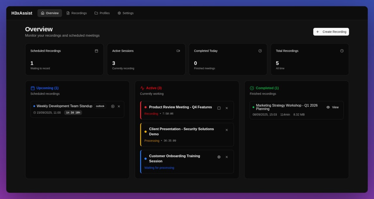 ☎️ H3xAssist — это автоматизированный помощник для онлайн-встреч, который записывает, расшифровывает и суммирует обсуждения с использованием