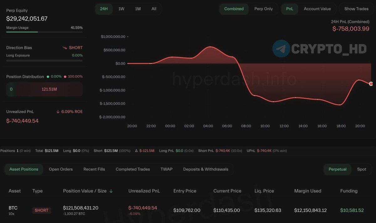 👀 Bitcoin OG увеличил шорт по BTC с 10х плечом до $120,000,000+. Точка входа: $109,762. Цена ликвидации: $135,320. Кошелек BTC: Hyperliquid (здесь шортит) Кошелек ETH: Hyperliquid Ранее: - вернулся - шорт на Binance - продает? - это все заговор? Crypto Headlines