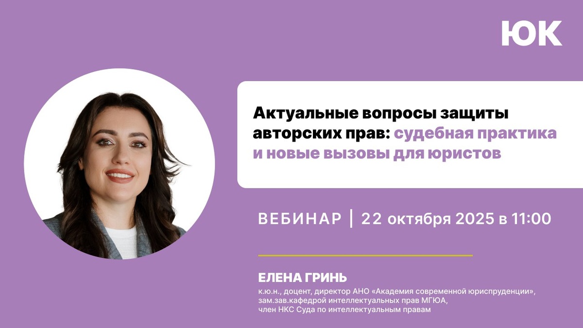 Спешим с анонсом вебинара на тему: «Актуальные вопросы защиты авторских прав: судебная практика и новые вызовы для юристов» 📅 Когда: 22 октября 2025 в 11:00 по мск. Участие бесплатное, регистрация здесь. 🎙 Спикер: Елена Гринь, к.ю.н., доцент, директор АНО «Академия современной юриспруденции», зам.зав.кафедрой интеллектуальных прав МГЮА, член НКС Суда по интеллектуальным правам. Спикер расскажет о ключевых изменениях в законодательстве в сфере зашиты авторских прав, новых правовых вызовах для юристов, а также о топ-5 новейших споров и направлениях по защите авторских прав ➡️ Регистрируйтесь по ссылке, чтобы подключиться к прямому эфиру и после вебинара получить запись. 🟣 Подписаться на канал «Юрист компании»