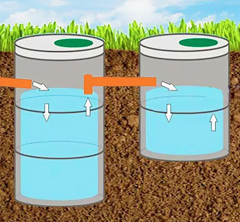 - Первый колодец (отстойник): Сюда поступают стоки. Тяжелые фракции оседают на дно, а осветленная вода переливается в следующую камеру.