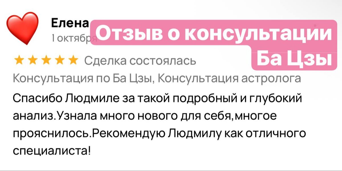Друзья, вот еще один отзыв о консультации, благодарю Елену и мне очень приятно получить такой прекрасный отзыв! 🙏🙏🙏 Подробнее о консультации тут! Связаться со мной https://t.me/liudmilaastro. Что такое Ба Цзы читайте тут! Как подготовиться к консультации читайте тут! #отзыв #астрологЛюдмила #консультацияБаЦзы #астрологмосква #баЦзыотзыв #картаСудьбы #опыт #благодарность #астрологиямосква #заказатьконсультациюастролога #личнаяконсультацияастролога #астрологонлайн #натальнаякарта #познатьсебя