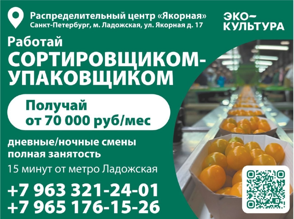 🎯 РАБОТА В САНКТ-ПЕТЕРБУРГЕ | БЕЗ ОПЫТА | ОФИЦИАЛЬНО 📦 Вакансия: Сортировщик-упаковщик 📍 Адрес: Санкт-Петербург, м. Ладожская, ул. Якорная, 17 💰 Зарплата от 70 000 ₽ в месяц на руки 🕑 График: 2/2 (день/ночь) по 12 часов 📄 Трудоустройство по ТК РФ 🚀 Мы предлагаем: - Стабильные выплаты 2 раза в месяц - Официальная ЗП по сдельной системе, чем больше выработка - тем выше доход Без опыта - всему обучим! - Отпуск 28 дней, оплачиваемые медосмотры и медкнижка - Доплаты за стаж и участие в акции “Приведи друга” - Возможна подработка! 👷♀ Что нужно будет делать: - Фасовать и взвешивать овощи (помидоры, огурцы, салат) - Сортировать продукцию по степени зрелости - Наклеивать стикеры на упаковку 🍅 Мы - АПХ ЭКО-культура, крупнейший агропромышленный холдинг России. Работаем в 8 регионах страны. Присоединяйся к нашей команде! Звоните по номеру: +79633212401 +79651761526 Более подробно с нашими вакансиями можно ознакомиться по ссылкам: https://spb.hh.ru/vacancy/124489561?hhtmFrom=employer_v