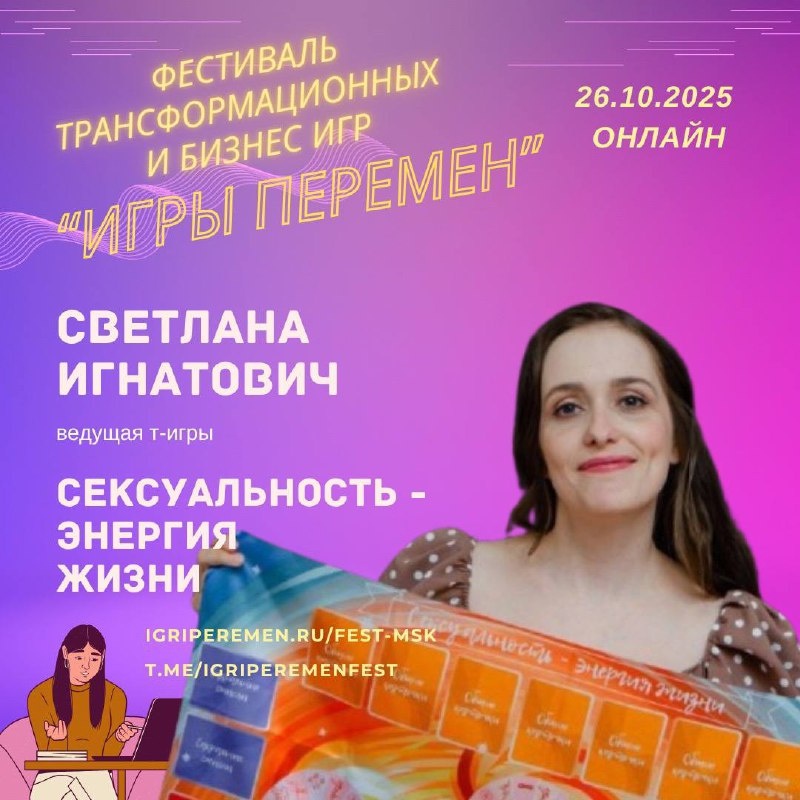 Друзья, у меня для вас теплые новости! ❤️ 26 октября в воскресенье я участвую в онлайн-фестивале «Игры перемен». Это целый день глубоких разговоров, интересных знакомств и игр, которые действительно меняют жизнь. За 1 день вы сможете посетить 4 трансформационные игры🎲. Я проведу для вас свою игру «Сексуальность - энергия жизни»🔥. Мы посмотрим на сексуальность как на умение получать удовольствие от ВСЕГО в жизни! ✨ Это та самая искра, которая зажигает наш интерес к миру, заставляет смеяться до слез, творить, мечтать и чувствовать себя живыми. Приходите на онлайн фестиваль, если вам важно: 💫 Найти свой следующий шаг в развитии. 💫 Познакомиться с душевными и близкими по духу людьми. 💫 Наполниться энергией и вдохновением. А еще у меня как ведущей есть 2 бесплатных билета (обычная стоимость 990 рублей), и я хочу подарить его тем, кто хочет перемен. Напишите в комментариях пару слов — зачем вам сейчас этот фестиваль? Итоги розыгрыша подведу 23 октября. Пусть удача улыбнется тому,
