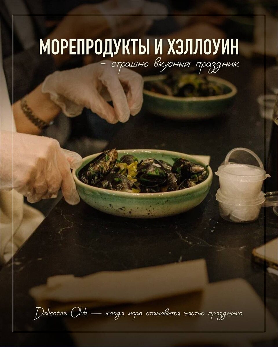 А на сам Хэллоуин мы ждем вас в ресторанах Delicates Club на Московском проспекте, на Петровском и Якорной, а если не хочется выходить из дома — всегда можно заказать доставку морепродуктов из наших магазинов!