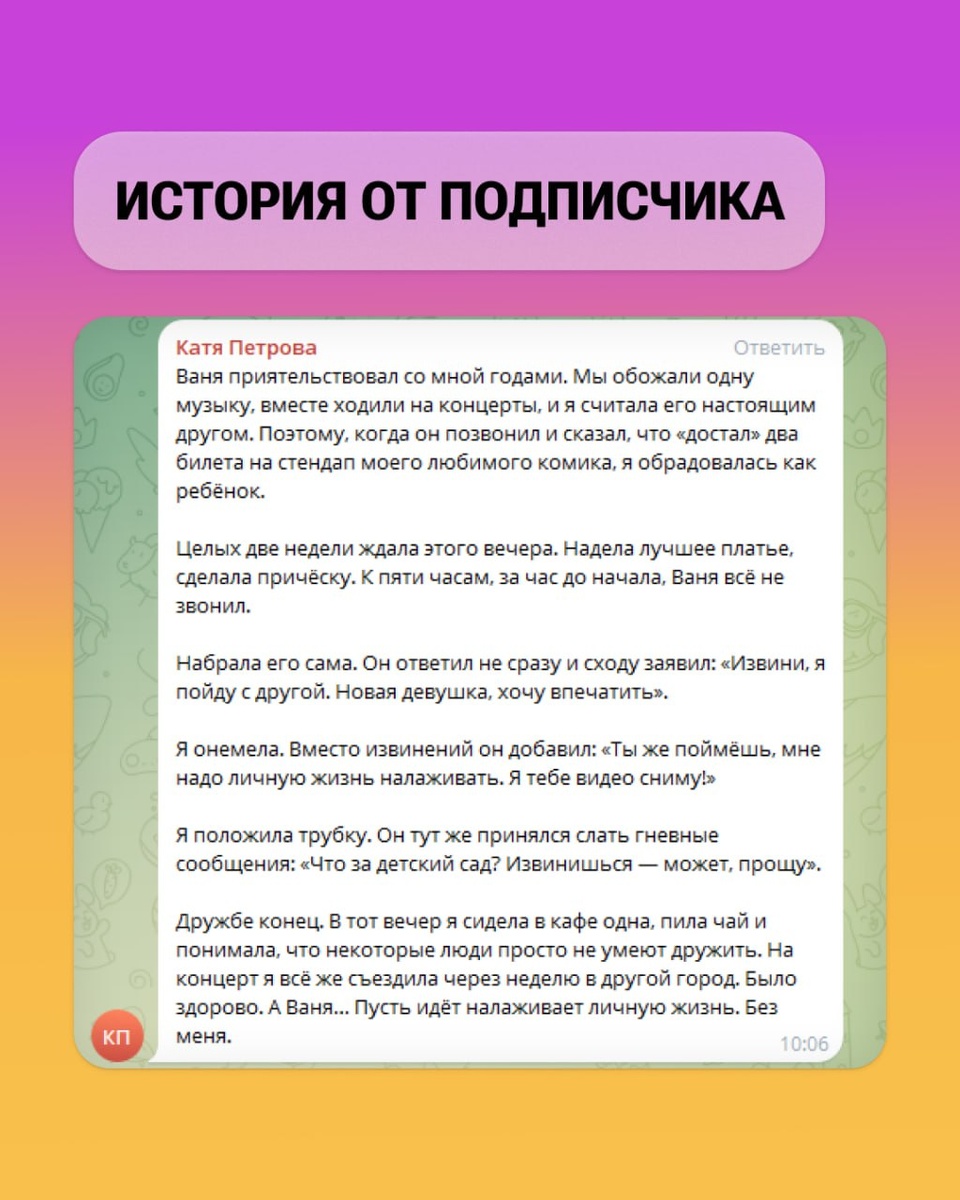 🤔 Кто в этой истории не прав? Подписчица рассказала: друг достал билеты на стендап её любимого комика — а в день концерта заявил, что идёт с новой девушкой. «Ты же поймёшь. Я тебе видео сниму!» Дружбе конец. Как считаете, кто в этой истории прав? 🦄 — автор права. Ваня поступил некрасиво 👍 — Ваня прав. Личная жизнь важнее 🙏 KASSIR.RU
