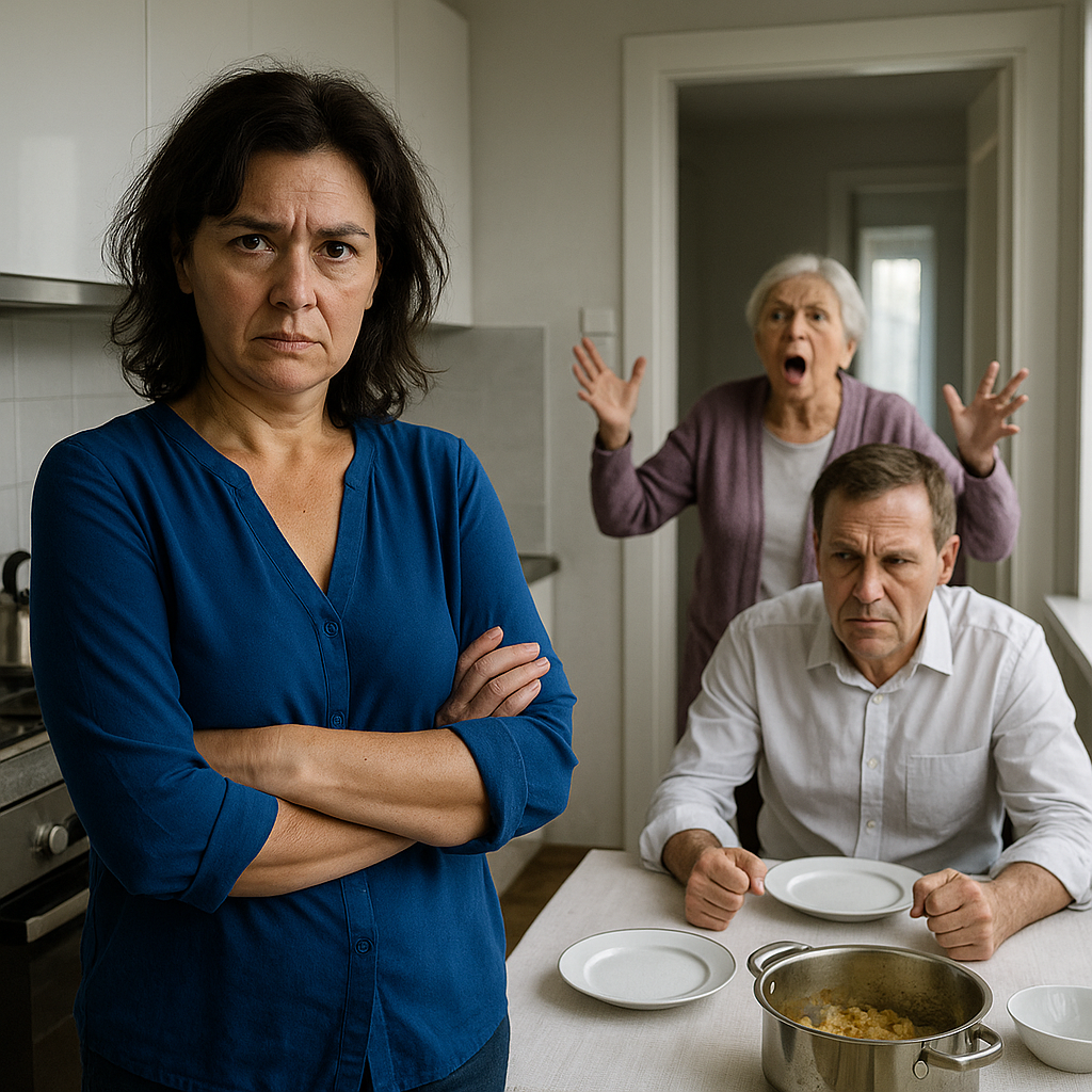 Валентина Петровна замерла в дверном проеме. Такого она точно не ожидала. За двадцать три года брака сына невестка ни разу не повышала голос, всегда кивала, соглашалась, терпела. А сейчас стояла посреди кухни — волосы растрепаны, на щеке мазок муки, глаза горят так, что жутко.