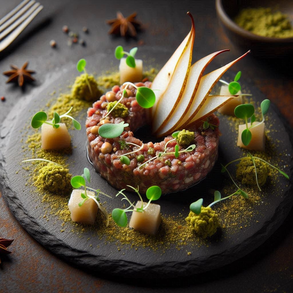 Если вы думаете, что печень — это только паштет и жарка с луком, приготовьтесь удивляться. Нежнейшая кроличья печень с её тонким вкусом идеально вписывается в азиатские, молекулярные и даже десертные концепции. Эти рецепты перевернут ваше представление о возможностях субпродуктов. Идея: Деконструкция классического тартара. Нежная сырая печень, сладость груши и острота васаби создают идеальный баланс вкусов.