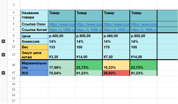 Вручную заполняются только столбики: ссылка, цена, комиссия, ссылка на 1688, цена закуп, вес, а всё остальное считается автоматически