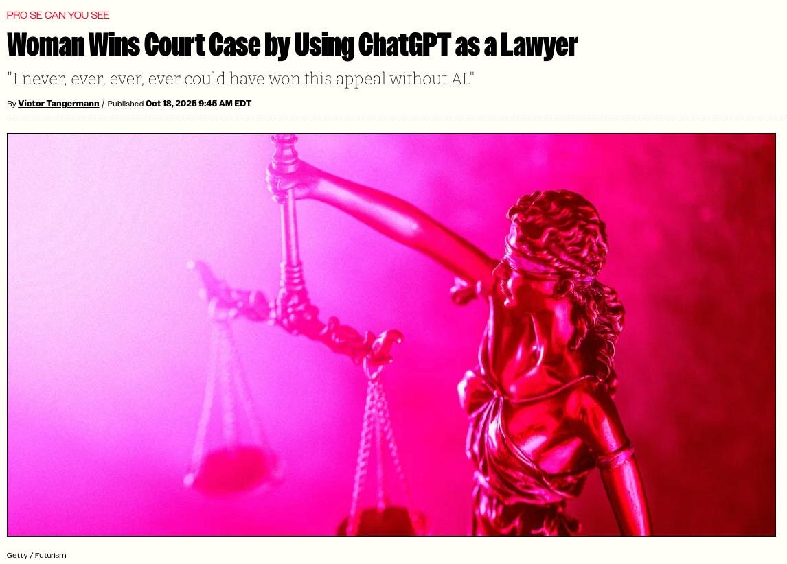 Интересное: ИИ приходит на помощь в самых неожиданных случаях. Вот история, где нейросети спасли женщину от выселения через суд. Девушка из Калифорнии проиграла суд присяжных и решила вместо адвокатов обратиться к ChatGPT и Perplexity. ИИ подсказали, как подать апелляцию, и девушка смогла отбиться от выселения и штрафов. Люди начинают защищать себя сами, но всё равно стоит быть аккуратными — ИИ склонен к галлюцинациям. В конце концов даже опытные юристы и судьи позорятся, ссылаясь на вымышленные факты. @lobushkin