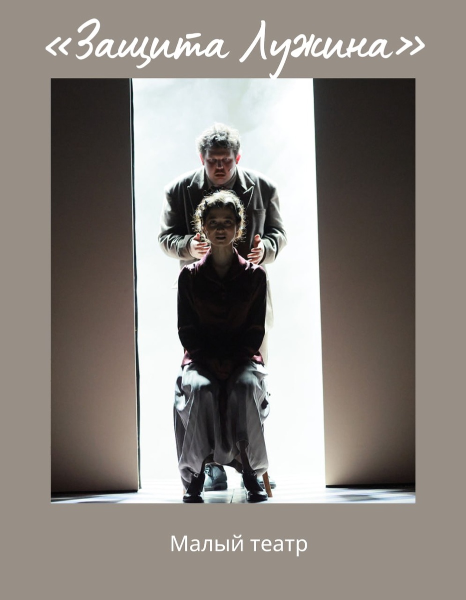 Ученик Сергея Женовача Владимир Данай поставил «Защиту Лужина» в Малом театре. На спектакле побывал Иоанн Лазарев: По событиям романа режиссёр идёт достаточно бегло, устремляясь в кризисные поворотные моменты жизни Лужина: знакомство с будущей невестой и её роднёй, турнир с итальянцем Туратти (Алэн Салтыков), роковые встречи с одноклассником Петрищевым (Алексей Мишин) и импрессарио Валентиновым (Константин Юдаев) после женитьбы. Данай планомерно превращает подробный психологический роман в череду коротких новелл о драматических отношениях между Лужиным и героиней. На гениального шахматиста мы смотрим глазами его возлюбленной. Хрупкая миловидная девушка в светлом теннисном платье сперва инициирует роман с нетипичным молодым человеком — полным взъерошенным чудаком-шахматистом. Стоя фронтально к зрителю, в отдалении друг от друга по обеим сторонам портала, они ведут любовный диалог на языке жестов — она вскидывает руку вверх, он отвечает тем же, она подаёт новый знак, он его повторяет —