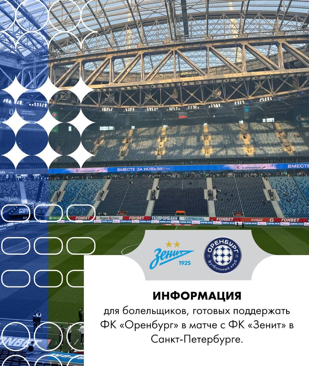Информация для болельщиков ФК «Оренбург», желающих посетить матч против «Зенита» в Санкт-Петербурге.