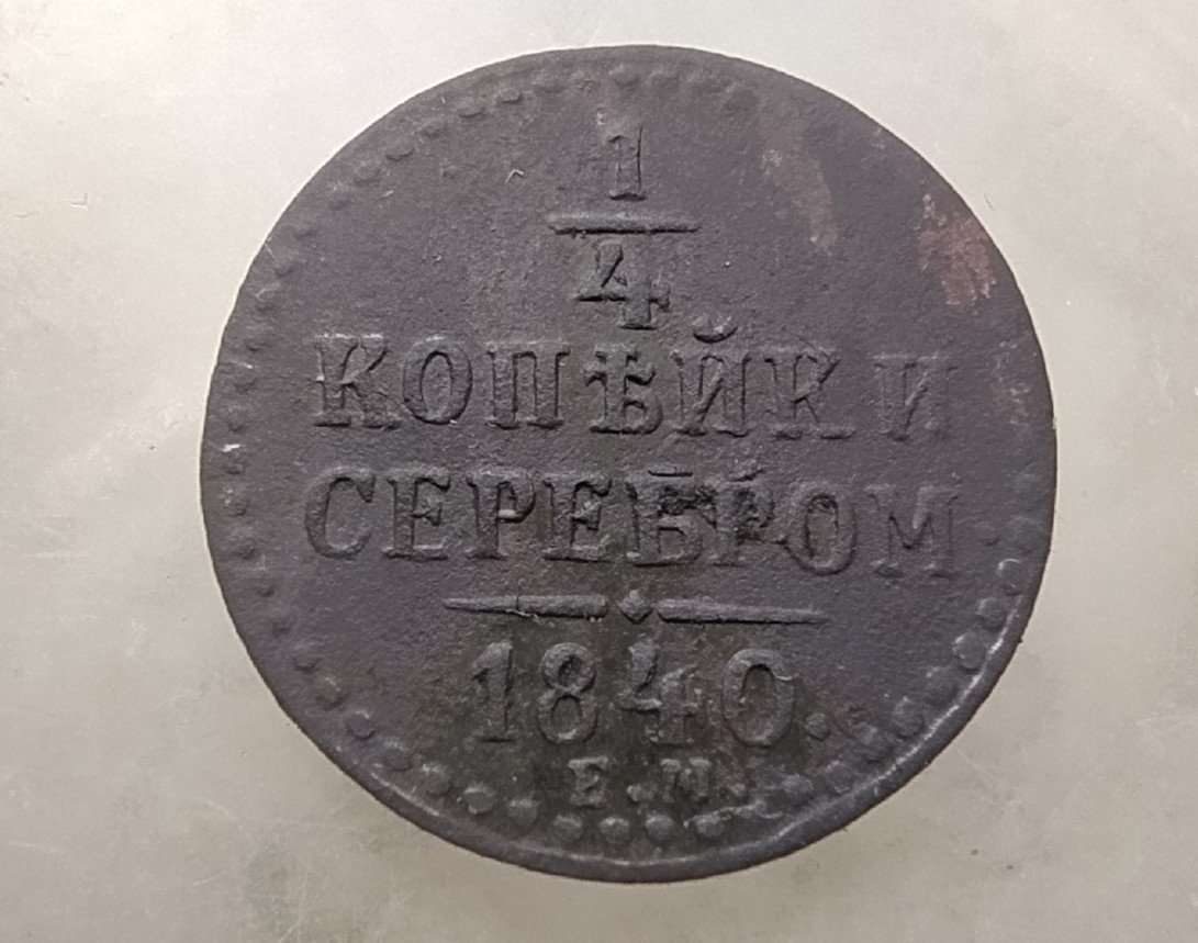 Обратил внимание, что четвертушки серебром редко имеют приличное состояние, если вдруг им пришлось побыть в земле полтора столетия. Сами по себе монетки очень маленькие, а потому элементы оформления имеют небольшие размеры. При длительном обращении или неблагоприятных условиях залегания изображение на монетах приходит в негодность. Иной раз невозможно рассмотреть буквы монетного двора. Четвертушек серебром у меня штук пятнадцать. И лишь пара штук из них относительно хорошо сохранилась. Вот одна из таких монет - 1\4 копейки серебром 1840 года ЕМ: Не каждый раз на такой маленькой монетке с легкостью разберешь буквы монетного двора. А тут четко видны ЕМ. Если верить каталогам, то тираж данный монеты 11 миллионов штук. Это довольно много для монет Империи, а потому монету можно назвать условно распространенной. Другое дело, что из-за своего небольшого размера они не очень охотно попадают под катушки металлоискателей. Да и не каждый кладоискатель-любитель сможет выхватить сигнал. Впроче