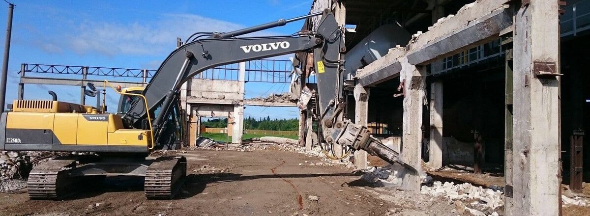 Для разрушения массивных элементов применяются экскаваторы с навесным оборудованием — гидромолотами, дробильными клешнями и резаками. При необходимости выполняется предварительное ослабление конструкции, после чего элементы аккуратно отделяются и опускаются на землю.