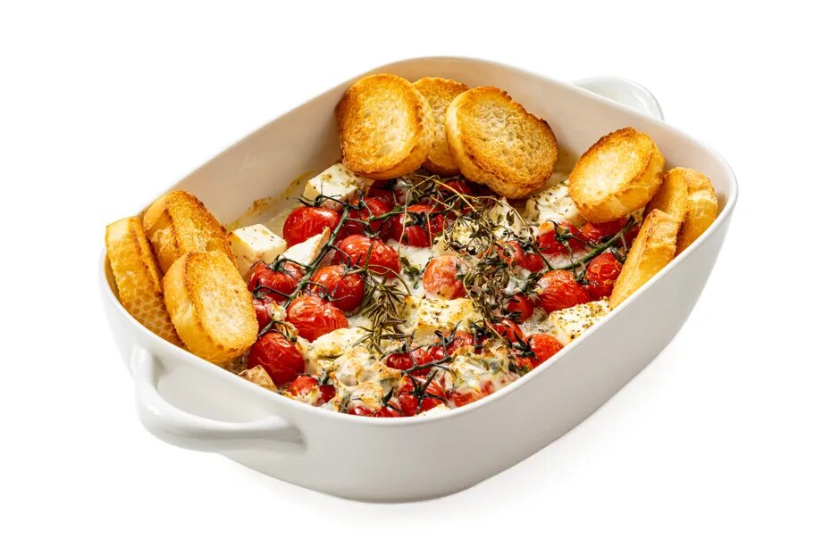 Рецепт горячей простой закуски из помидоров и сыра - идеальный вариант для тех ситуаций, когда "некогда готовить". Это классическое, проверенное временем сочетание, которое полюбилось многим из нас. Такую горячую закуску из помидоров и сыра можно подать как на семейный ужин, так и предложить гостям под бокал вина. Сыр камамбер 1 штука Сыр фета 150 г Сыр моцарелла 150 г Помидоры черри 400 г Оливковое масло 30 мл Чеснок 2 зубчика Свежий тимьян 2 штуки Свежий розмарин ½ веточки Сушеный орегано 1 чайная ложка Соль по вкусу Молотый черный перец по вкусу Французский багет ½ штуки 1.Подготовить все ингредиенты для рецепта "Сыр с помидорами в духовке". Разогреть духовку до 190 градусов. 2.Камамбер разрезать на 8 частей. Фету нарезать кубиками. Моцареллу порвать на кусочки. 3.Слегка смазать форму для выпечки оливковым маслом и выложить в нее помидоры и раздавленные зубчики чеснока. 4.Далее выложить сыры. 5.Посыпать помидоры и сыр сушеным орегано. 6.Сверху выложить веточки тимьяна и розмарина.