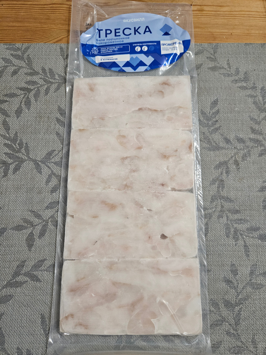 Купили и нужного, и ненужного :) Морозилка стала посвободнее, так что можно её снова загрузить. Обычно мы идём за мясными полуфабрикатами и молочкой (творог, молоко, кефир). В этот раз купили не только нужное и не всё выгодно в плане альтернатив в других местах. Я обошла 5 точек у работы, а потом меня встретил муж и уже понёс это всё домой, и по дороге мы зашли ещё в один магазин. Треска на -20%. Единственное, что взяли не по зелёному ценнику, а я накануне выбрала любимым товаром для скидки в 20%. Замороженную рыбу на ЗЦ тоже видели: дорадо, сёмга и вроде тиляпия. Везде была уценка из-за разгерметизации упаковки. На ЗЦ пачка очищенных креветок, тоже разгерметизация. Дома расфасовали на 2 пакета по 100 грамм и загерметизировали. Не планировала и обычно я за очищенные креветки не готова платить, но тут рука сама потянулась. Из рыбы взяла на ЗЦ на пробу копчёную селёдку и х/к скумбрию - скумбрию время от времени покупаем здесь на -20%. Нам одной рыбы хватает на двоих поужинать. Эту съели
