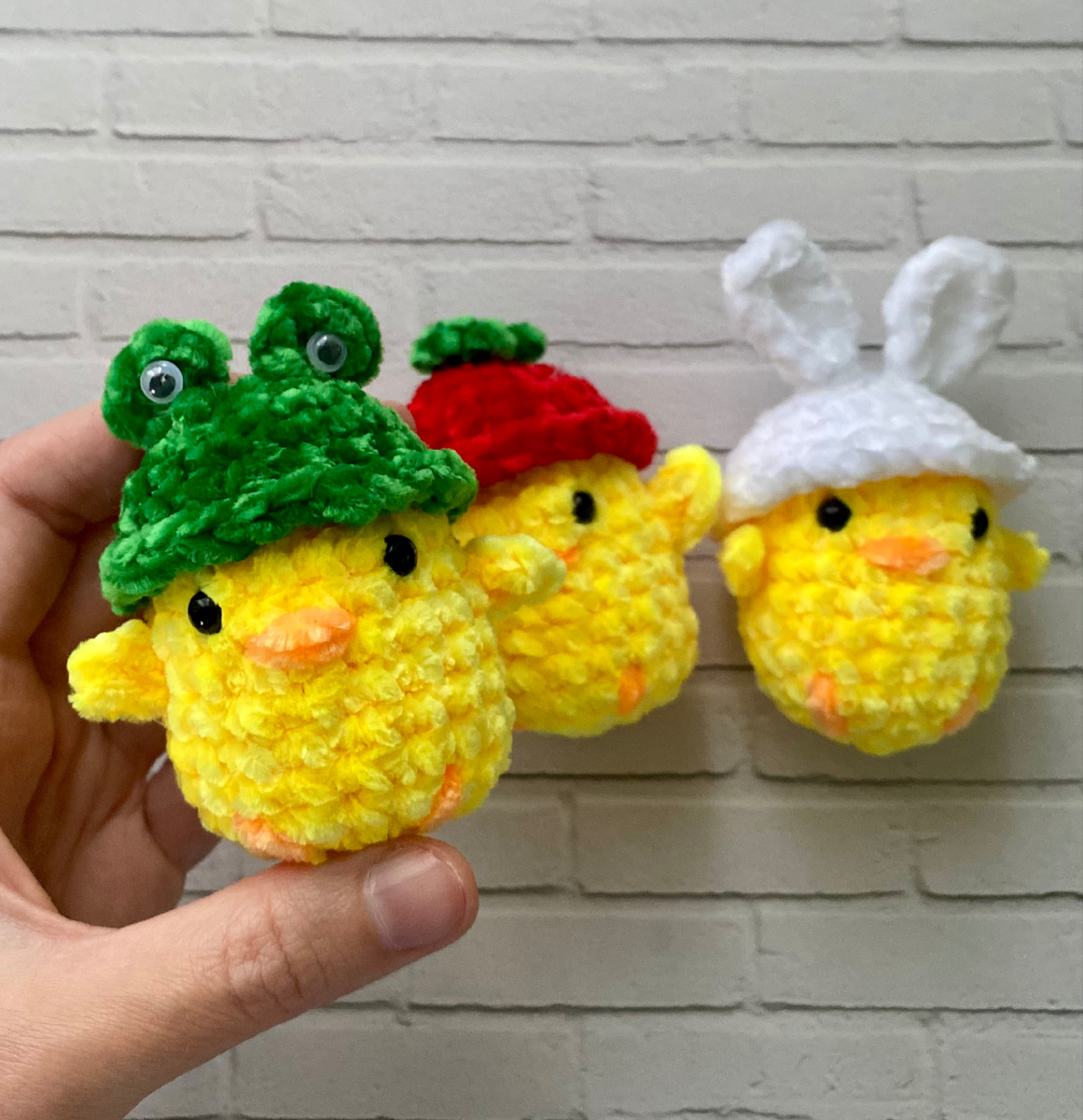 КА: 6 сбн Ряд 2: пр*6 (12) Ряд 3: (1 сбн, пр)*6 (18) Ряд 4-10: 18 сбн (7 рядов) Вставляем глазки между 4 и 5 рядами Ряд 11: (1 сбн, уб)*6 (12) Ряд 12: уб*6 Крылья: прикрепляем нить в 6 ряду, 3 вп, 1 сс, 1 пссн, 1 сс в петлю основания Шапочка: КА: 6 сбн Ряд 2: пр*6 (12) Ряд 3: (1 сбн, пр)*6 (18) Ряд 4-5: 18 сбн (2 ряда) Ряд 6 вяжем за переднюю стенку петли: (1 сбн, пр)*9 (27) Шапочка-ягодка: КА: (3 вп, сс)*5 Шапочка лягушки: КА: 5 сбн Шапочка зайчика: 6 вп 1 сс, 1 сбн, 2 пссн, в последнюю петлю 1 сбн, 1 вп, 1 сбн Вяжем по другой стороне: 2 пссн, 1 сбн, 1 сс