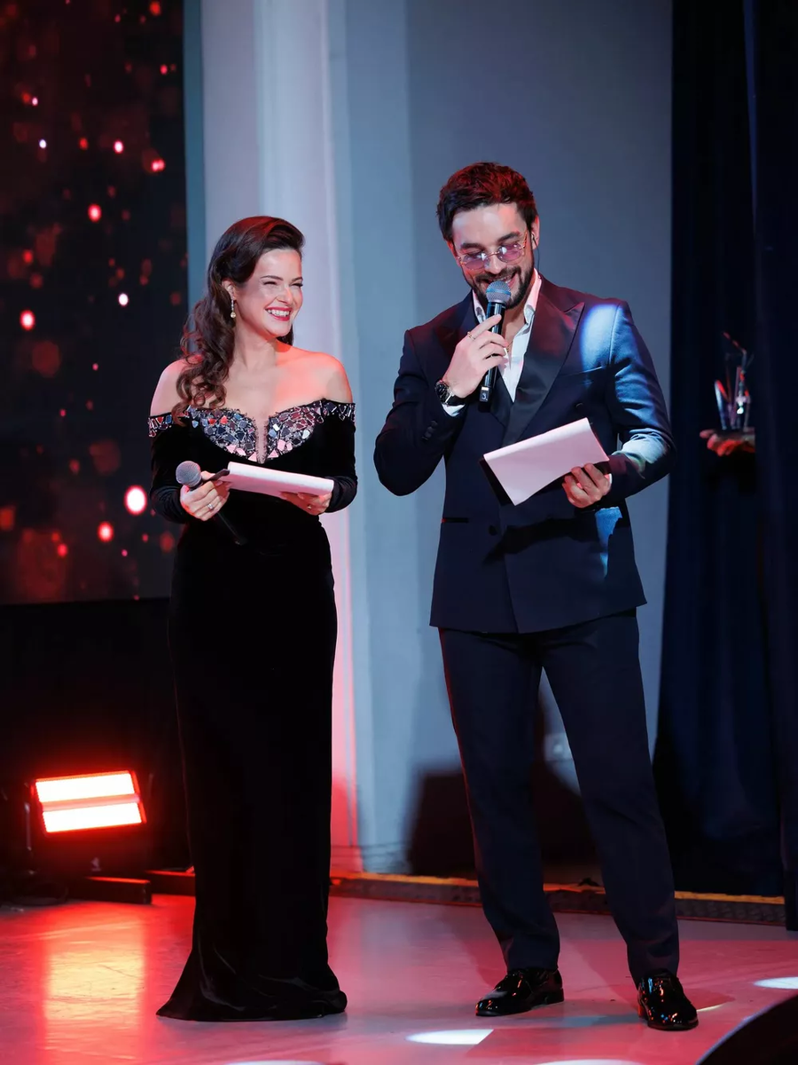 На прошлой неделе прошла косметическая премия, а по факту - мини-неделя моды в одном вечере. На ковровой дорожке InterCharm x Hello 2025 гости раскололись на две команды по цвету - чёрные и красные. Смотрим, что сработало и что стоит взять на заметку. Ведущие вечера: Актеры Анна Пескова и Константин Тарасюк Анна Пескова в узнаваемом бархате Katya Dorogina. Лиф усыпан «осколками» кристаллов, будто разбитое зеркало сложили заново и закрепили по линии выреза. Приём работает на камеру безотказно: свет цепляется за грани, талия прорисовывается, линия декольте графичная, но не агрессивная. Главное достоинство образа - посадка. Бархат не «утяжелил» фигуру, как это часто бывает. Константин Тарасюк в классическом смокинге с матовым бортом. Без лишних деталей, зато аккуратная посадка. Рядом с бархатным платьем такой костюм работает правильно: подчёркивает партнёршу. Яна Рудковская - тотал Chanel, и, кажется, в том же образе, в котором она мелькала на другой светской ночи - на вечеринке ТГ-канала