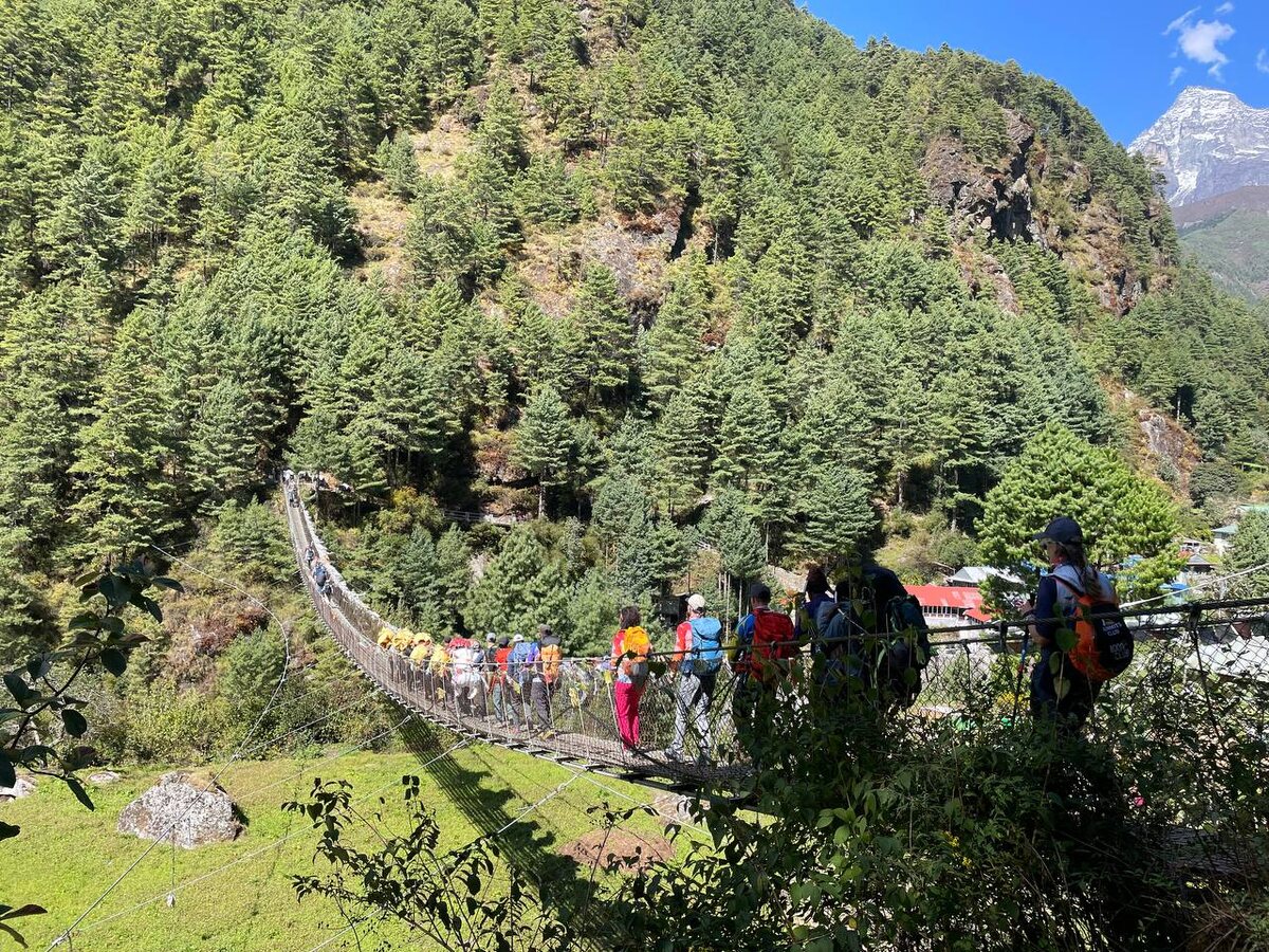 Подвесные мосты – вот что ещё очень украсило наш путь сегодня. Их было много. Длинные, проходящие над бурными потоками, живописные. За пару километров до Намче Базара притомившихся путников ждёт крутой и долгий подъём. Ступенька за ступенькой, тропинка за тропинкой. Кажется, что он никогда не закончится, ведь на этом участке собственно и набирается вся высота до 3400.