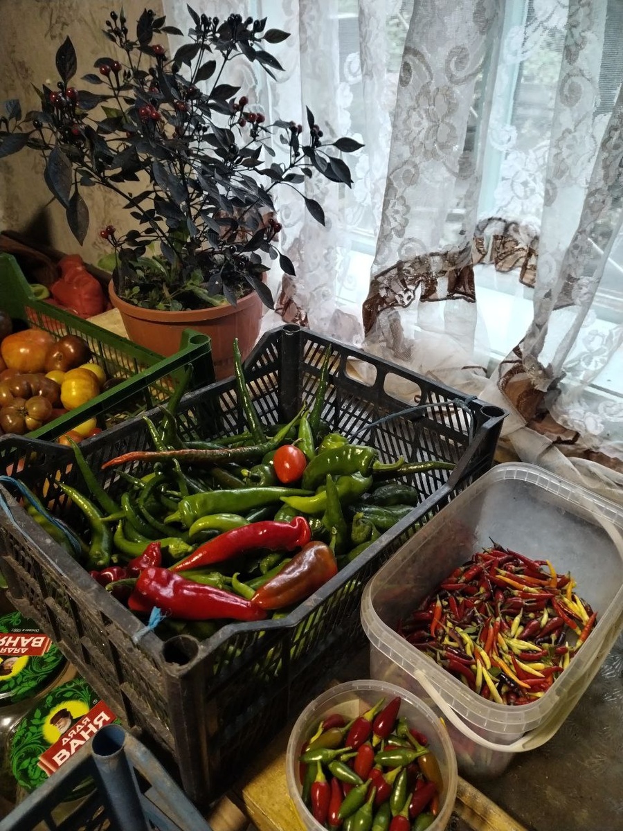 Сегодня собрала все горькие перцы. Тещин язык в парнике вообще себя комфортно чувствовал, но пора уже парник освобождать. Там скоро будет хранилище для, пионов. А этот, с меня ростом, Кайенский Длинный джо.😊
