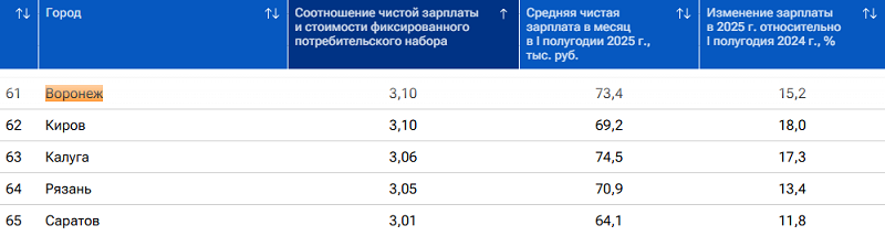 Итак, наши результаты. Средняя зарплата в Воронеже за год выросла на 15,2% и достигла 73 тысяч 400 рублей. На эти деньги внутри региона можно купить 3,1 фиксированных набора. По цифрам вроде бы все неплохо, но это все равно лишь 61 место.