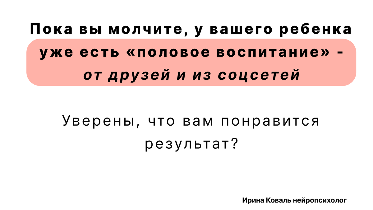 ➡️Родители ждут вопросов, а их все нет. И родители думают: “Ну и хорошо, пронесло”. ➡️Или ждут, пока ребенок подрастет, чтобы рассказать ему все. А когда время пришло, то ребенок говорит: “Да я уже все знаю” или “Отстань, мне некогда”. Но природа не терпит пустоты. Если вы не формируете картину мира ребенка, это сделают другие - TikTok, одноклассники, соцсети. И вот тогда будьте готовы, что у вашего ребенка в голове сформируются вот такие “истины”: “Ревнует - значит любит” “Любовь - это когда страсти бушуют и эмоциональные качели” “Дружеский секс - это современно” “Нельзя терпеть возбуждение, если хочется - нужно мастурбировать” “Нормально смотреть порно” “Сначала нужно попробовать, подходим ли мы друг другу в сексе, а потом жениться” “Девушка должна краситься и сексуально одеваться, чтобы иметь успех у парней” “Эскорт и вебкам - успешная работа” ❓Вы действительно готовы доверить формирование таких убеждений алгоритмам и случайным людям? ✅Не ждите вопросов или подходящего момента, что