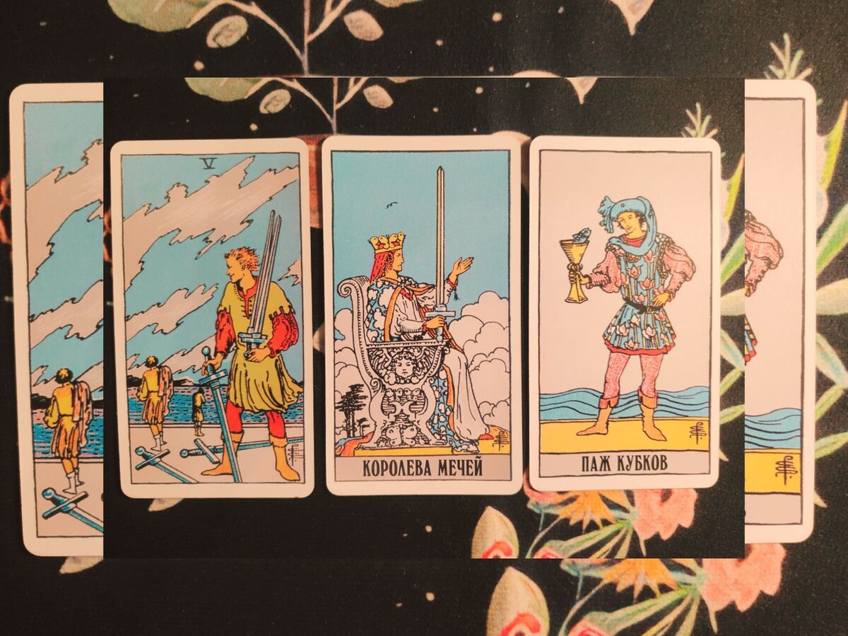 Давайте разберем его по полочкам, чтобы действительно «расставить всё по местам». Общая картина ситуации: Это история о конфликте(5 Мечей), где главную роль играет ясный, но холодный разум (Королева Мечей), а на горизонте появляется новая, нежная, но пока незрелая эмоциональная энергия (Паж Кубков). Толкование карт в раскладе 1. 5 Мечей (Прошлое / Суть конфликта) Эта карта указывает на недавнийконфликт, спор или словесную битву, в которой была одержана "пиррова победа". Кто-то добился своего, но ценой напряжения, обиды и горького послевкусия. · Что это значит: Ситуация началась или была отмечена борьбой, эгоизмом, жестокими словами или тактикой "победитель получает всё". Возможно, вы чувствуете себя побежденным или, наоборот, одержали верх, но теперь пожинаете плоды разрыва или непонимания. Атмосфера напряженная, есть чувство обиды и горечи. 2. Королева Мечей (Настоящее / Совет) Это ключевая фигура в данной ситуации.Королева Мечей — это человек (чаще всего женщина, но может быть и муж