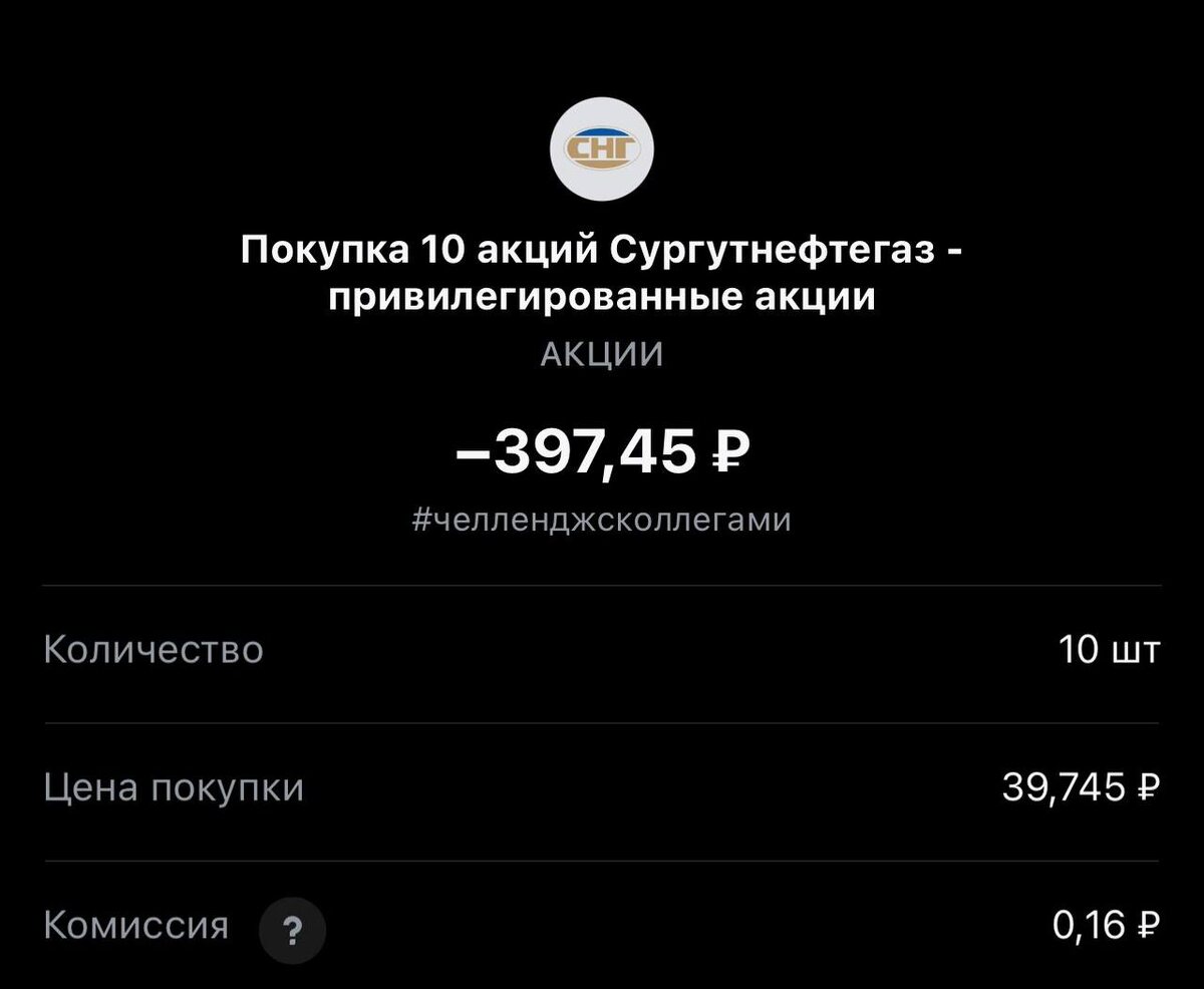Еще одна покупка на сегодня #295, обращаю внимание покупаем один лот. Статистика портфеля на стороннем сервисе, можно посмотреть по "ссылке" Напомню это челлендж с коллегами, каждый рабочий день пополняем брокерский счет на 250 рублей и инвестируем. Если возникли вопросы или есть не понимание, что делать. Задавайте «тут» Покупка #295 🟢 «Сургутнефтегаз преф» 39.74 rub #SNGSP 1 лот #каждыйсможет #челенджсколлегами 🚪finbazar ✈️ Стас Мироненко 📹Youtube | 📹Rutube